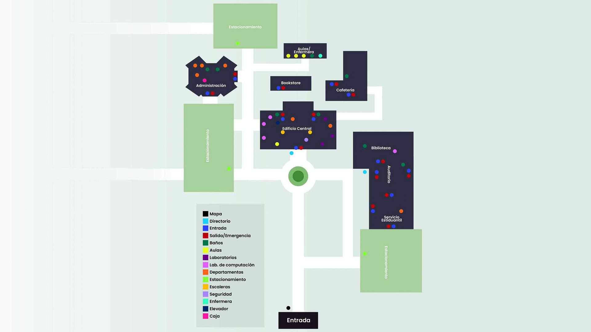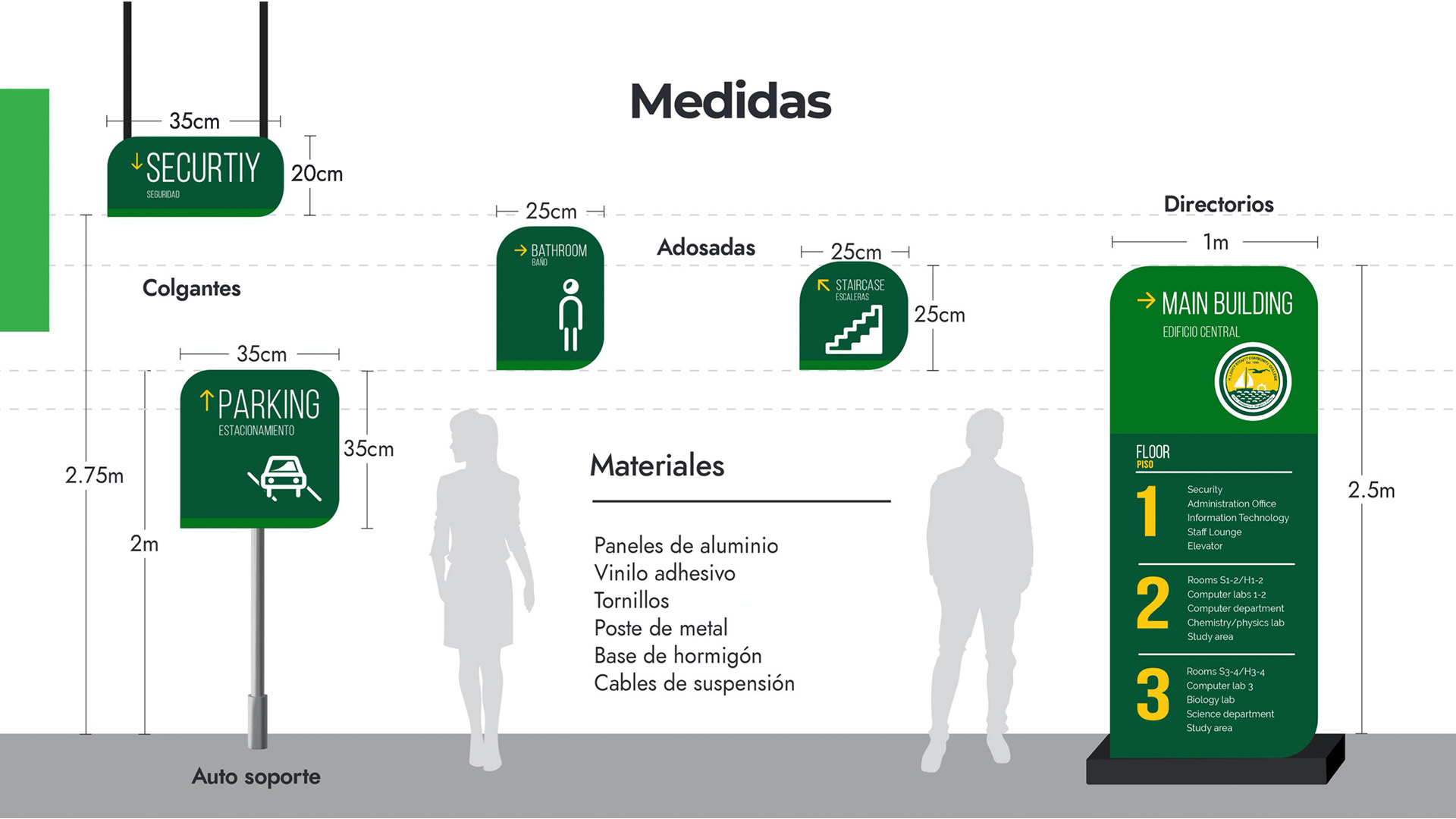 El sistema de señalización funcionará para orientar, informar y organizar a los usuarios y su comportamiento en los puntos del espacio o entorno que componen el campus de la escuela para hacer un entorno más comprensible, seguro y funcional.